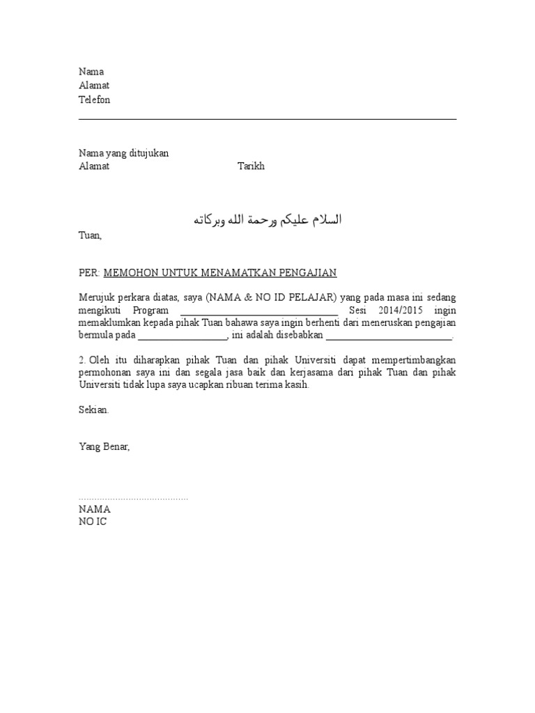 Ia ragu bahawa dia akan mendapat rujukan yang baik dari syarikat yang dia berhenti tanpa notis. Diharapkan pihak tuan dapat mempertimbangkan notis saya ini dan segala jasa baik dan kerjasama dari pihak tuan sepanjang saya berkhidmat di sini amatlah dihargai. Surat ni aku create time nk berhenti kerja kilang wong resignation latter atau surat rasmi berhenti kerja notis sebulan, seminggu atau 24 jam. Sesetengah syarikat mensyaratkan polisi notis berhenti kerja. Berikut dikongsikan contoh surat berhenti kerja terbaik yang mudah dan ringkas dalam bahasa melayu dan inggeris buat panduan pekerja yang berhasrat. Contoh surat berhenti kerja notis sebulan. Surat berhenti kerja adalah surat pemberitahuan kepada hr atau majikan sekiranya mereka ingin meletak jawatan daripada pekerjaan mereka sekarang. Khas untuk mereka yang nak berhenti kerja tapi masih pening nak buat surat rasmi di sini dikongsikan surat berhenti kerja yang mudah dan ringkas dalam bahasa melayu dan inggeris bagi notis perletakan jawatan sama ada 24. Namun adanya contoh surat berhenti kerja sangat dibutuhkan pegawai untuk merealisasikan pengunduran dirinya. Artikel kali ini akan berkongsi tentang contoh surat berhenti kerja. Surat ni aku create time nk berhenti kerja kilang wong engineering. Jika anda mahukan template surat berhenti kerja dalam bahasa inggeris, sila download di sini. Documents similar to contoh surat berhenti kerja notis sebulan.